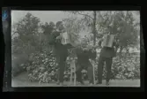 "Boda." Tre unga musiker i en trädgård. En som spelar fiol, två spelar dragspel.