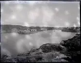 Handskrivet på kopian: "Marstrand, norra inloppert. T.h. fyrvaktarhus med inbyggd fyr. T.v. kallbadhuset omkr. 1890".