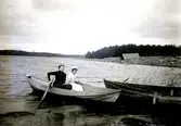 Handlande Strandqvist, Skövde, i sin båt och i bakgrunden Kung Oscar II:s lustyacht Drott i Marstrands hamn 1890-1900.