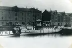Djurgårdsvarvet i Stockholm, 1951-05-19. Uppe vid slupskjulet (t höger på bilden) ligger SÅAs Flora under ombyggnad, som var klar 1952.