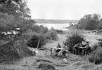 Bilden visar en grupp sjömän från Fylgia som intresserat tittar på hur en kamrat undersöker marken på Milos.