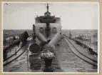 Örlogsfartyg under färd på havet bland skummande vågor. Ombord på fartyget skymtar bestättningsmän.