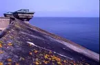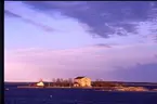 Bilden visar Laboratorieholmen sett från havet. Till vänster sidan ligger Kokhuset och till höger fyren.