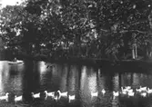 Svartån med simmande gäss och ankor.