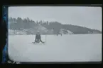 'Text på baksidan av fotot: ''Fridlyst ek å Aspenäs (vid sjön Aspen). (Genomskärning ca 3 m, höjd 25-27m). :: :: Eken fotograferad på avstånd, med personer synliga framför den. Litet skjul intill eken. Hägnad på avstånd. :: :: Ingår i serie med fotonr. 895:1-4.'