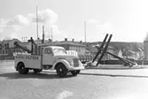 Bärgningsbil står utanför Hammarqvists bilverkstad som låg utmed Borgmästaregatan, kv Nålmakaren. (Se även bildnr GB2_3676, GB2_3677)