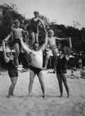"Tulebos starke man" Karl Alberts (mannen i badbyxor) står i mitten på stranden vid Tulebosjön, 1930-tal.