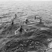 Kvinna i baddräkt på en Albin Viggen. I vattnet en badande man med solhatt.