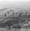 Badplatsen i Åsa. Strandvy med stenig strand. Eka i vattnet. I bakgrunden "Badcaféet".
