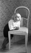 Barnkläder visas på Nordiska Kompaniet 1941. Pojke sitter i trappa iklädd kavaj och kortbyxor, knästrumpor, knytskor och keps. Han håller en segelbåt med ena handen.