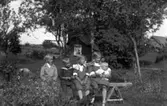 Barnkläder visas på Nordiska Kompaniet 1941. Pojke poserar vid cykel, iklädd kavaj och knäbyxor av tweed, rutiga strumpor, promenadskor och basker.