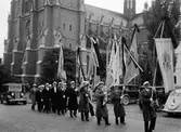 Stationskarl Erikssons begravningsprocession med standar i teten passerar Töreboda skola 1926.
