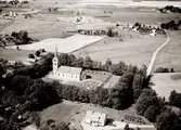 Vykort på bostadshus i Kyrkängen. Lindome kyrka syns i bakgrunden.