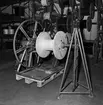 MF upptar materiel för posttjänsten som tillhandahålls av Postverkets Centralförråd (IKC). Foto april 1970. Cykelställ, utan tak, flyttbar, liggande. Med plats för 10 cyklar, placerade rakt fram. Art nr 275.60. Tillhör postkontoret Skärholmen 1.