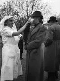 "Överraskningsmoment satte beredskapsavdelningarna på hårda prov" - behandling av kvinna som utsatts för arsingas, beredskapsövning, Vaksala torg, Uppsala 1941