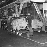 Sjöhistoriska museets permanenta utställning fotograferad 1987. Monter med ångmaskinanläggning för medelstort handelsfartyg. I monter till vänster i bakgrunden en diselmotormodell, Göta-verkens diselmotor 1957.