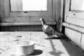 Två soldater i uniform m/1910 vid en vagn med brevduvor.