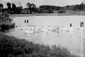 "Årnakullasjön med svanar", men det förefaller snarare vara en flock med tamgäss. Foto från omkring 1926-1928. Fotografens moster Augusta bodde i Årnakulla.