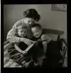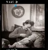 1713 Orrefors Glasbruk Ingeborg Lundin. Sittandes i en fåtölj med ett litet barn i famnen.