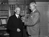 Distriktsordföranden i Uppsala läns JUF-distrikt, sekreterare Henrik Nystedt överlämnar ett förtjänstmärke i guld till bankdirektör J H Jönsson
