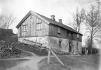 Bostadshuset i mitten låg på Gröna gatan 11 i Falkenberg, sedermera fattighus (1873-93), och revs 1916. Grönsaksodling i förgrunden med störar för ärter eller bönor.