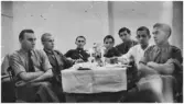 "Karantänsförläggning" på Kvarnbyskolan för överlevare från koncentrationsläger i Tyskland och Polen 1945. Skolan fungerade under denna sommar som beredsskapssjukhus. Sju allvarliga unga män (flyktingar) sitter runt ett bord i ett rum. Abraham Frischer (1923 - 2009) andra person från höger i bild. Relaterade motiv: 2024_1281 - 1299.