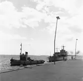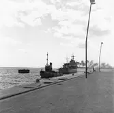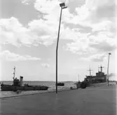 Utsikt över Skeppsholmen med skeppsgossebriggen Falken och logementsfartyget Vanadis f.d. fregatt. I bakgrunden Galärvarvet och Nordiska museet. Fotot taget från Blasieholmen.