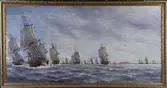 Porträtt av Sveabolagets chef Emanuel Högberg, framför Jacob Häggs tavla föreställande Fregatten Vanadis.