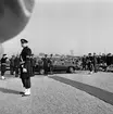 Flottister går i en parad längs Drottninggatan i Karlskrona, ledda av en fänrik som gör honnör mot Konteramiral Samuelson, som står med andra högre sjöofficerare utanför Bataljon Sparre. Fotot är daterat till den 17-3-52.