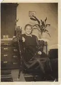 "Lisa" Elise Ingeborg Johansson (född Olsson 1898 i Torp, Uddevalla) sitter i sin bostad Labacka 1:2 "Lund" 1917. Gift med Axel Johansson, Labacka 1:2 "Lund".
