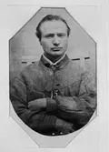 "Foto ur album för år 1861 öfver fångar förvarade å Malmö straff och arbets fängelse.No 222. Peter Stenberg. Förfalskning av Danskt mynt. 40 år gammal född i O Håme sn. af Hallands län. Högst opålitlig."