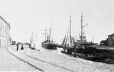 "Hamnparti" från Varberg. Hamnmagasinet till vänster uppfördes 1874. Det större fartyget längst ute i hamnen t h är ångbåten Neptun från Halmstad, som även har segel, som fraktade sten, kol, koks och styckegods. Traden var Göteborg-Lübeck. På kajen ligger räls för godsvagnarna; Järnvägen Varberg-Borås ingivdes 1880.