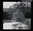 En kvinna sitter och syr/ broderar på balkongen till familjen Morthensens villa Solveden, Djursholm.