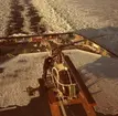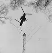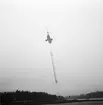 Bilden föreställer en så kallad flygande banan - en helikopter typ Vertol 44 som svävar knappt över vattenytan. Från bakdelen hänger en wire ner i vattnet. Förmodligen är det en hydrofon för ubåtsjakt.