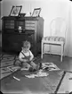 "Husmor med barn i hemmiljö" Ett barn sitter på golvet och river sönder en tidning Interiör