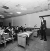 Hasselfors bruk 19 augusti 1965 En man med mörk kostym med vit skjorta och slips står framför stor anslagstavla med en mängd affischer om Hasselfors bruk.