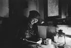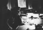 Motorskonaren Lisa av Bergkvara. Interiör från skansen med kock och 3 matroser samt 2 pojkar från land på besök.