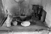 "Limpootta" på järnspisen (fotogenköket) i snickarboden. Hembygdsgården/Börjesgården i Hällesåker, Lindome 1992-06-29.