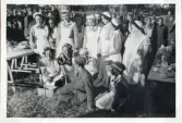 "Med 9 Komp på underhållning" Några lottor, några serveringsflickor och en man i uniform vid några kaffebord i en trädgård. I bakgrunden syns resten av mannarna.
