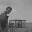 En man med skägg och jacka sitter i en roddbåt men en kräftbur i händerna.