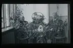 "Lisa Johansson, Fogelstad." En kvinna pysslar med blommande krukväxter i ett rum.