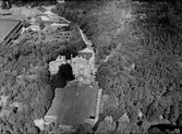 "Tjolöholms Slott, Flygfoto." Slottet sett söder ifrån med den formella trädgården i förgrunden, odlingar och ekonomibyggnader omgivet av slottsparken och de skogsklädda höjderna. I det nedre vänstra hörnet syns att kupolen på James Dicksons mausoleum är intäckt; kanske den träkåpa Dicksons använde som skydd åt den vintertid.