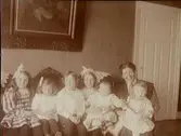 "Stora huset" i Hallsberg. Rumsinteriör, en kvinna och sex barn. Gerda Thermaenius (född Callmander) med barn och deras kusiner.