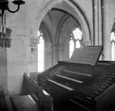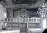 Interiör mot läktaren och orgelfasaden i Odensvi kyrka före restaurering.