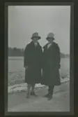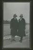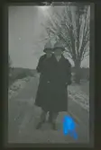 "Olga Andersson, Britta Larsson." Två leende kvinnor på en landsväg.