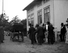 Begravning: Avgång från Lilla Torget till Domkyrkan. Bärare poliskonstaplar med bland andra överkonstapel Dahl närmast i bild. Närvarande prosten Erland Björk. Mannen på kuskbocken anställd hos åkeriägare Alfred Pettersson, Kalmar.