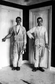 Målarmästaren Nils Nilsson och Axel Hörlin (sittandes) jobbar med iordingsställandet av Tobaksmuseet 1967.