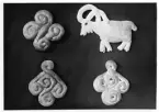 "Julkusar, bakade till julen 1929 av Fru Anna Forsvick, Delsbo. De mörkare är bakade av messmörsdeg. (De bakades i givarinnans barndom av 'bulldeg' (limpdeg). De ljusare äro bakade av vetedeg."