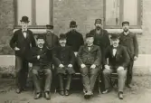 "Bolaget utvecklades snabbt och verksamheten utvidgades från tillgodoseendet av det lokala behovet till utförandet av anläggningar och leveranser även på långt avlägsna orter. Härför erfordrades större lokaler och ökad maskinell utrustning. År 1890 byggdes större smedja samt nytt ångpannehus. År 1891 byggdes nytt gjuteri och år 1892 inrättades grovplåtslageri. - Företagsledare och tjänstemän omkring år 1898 - Sittande från vänster Ingenjör August Lager, David Nylander, Birger Strömqvist och Edvard Bengtson. Stående från vänster Bokhållare Justus Bäck, Snickareförman Lars Hedberg. Gjuteriförman Storberg, Plåtslageriförman O.A Johansson och Verkm. Olofson." Borås Mekaniska Verkstad.