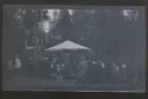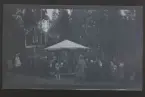 Skansen. Vårfesten 1899. Ett ekipage i öppen vagn. Några glada personer sitter i vagnen, en kusk sitter på kuskbocken.